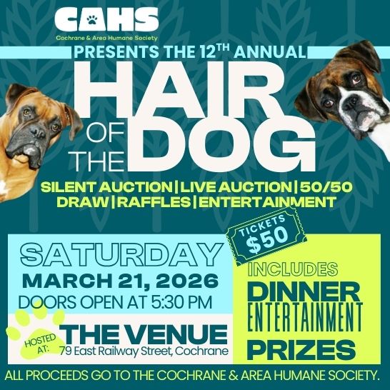 The Cochrane & Area Humane Society is excited to host a wide range of events throughout the year. From adoption events and fundraisers, to our biggest event of the year, our Wags & Whiskers fundraiser, the CAHS is always planning something to bring to you, and support our mission of saving lives and changing lives. We hope you’ll join us.