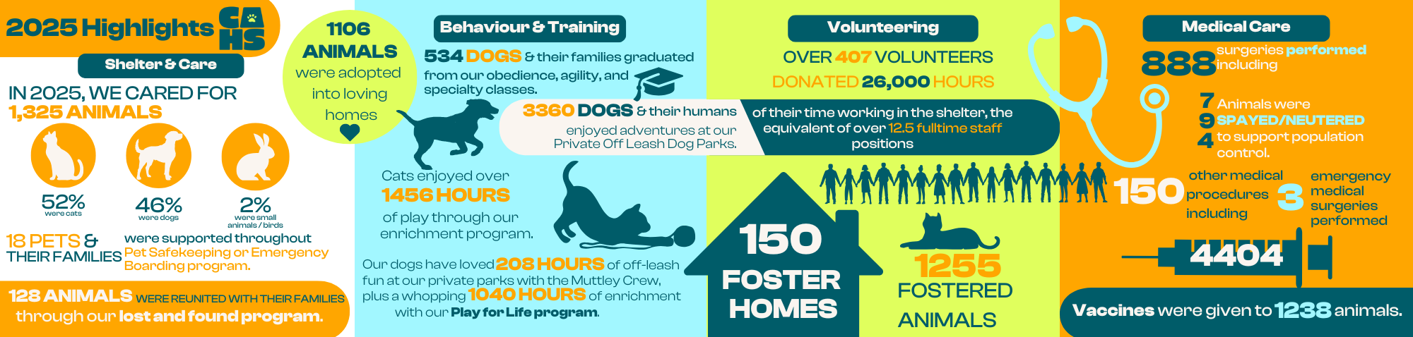 The Cochrane community continues to demonstrate their strong support of the Society through volunteerism, sponsorship, memberships and donations of cash, food and supplies. Our 2021 annual report and our 2021 audited financial statements show how donor dollars support our organization. On behalf of the animals, the shelter staff, and the volunteers, we want to extend a warm thank-you to all who have supported the Society over the years.