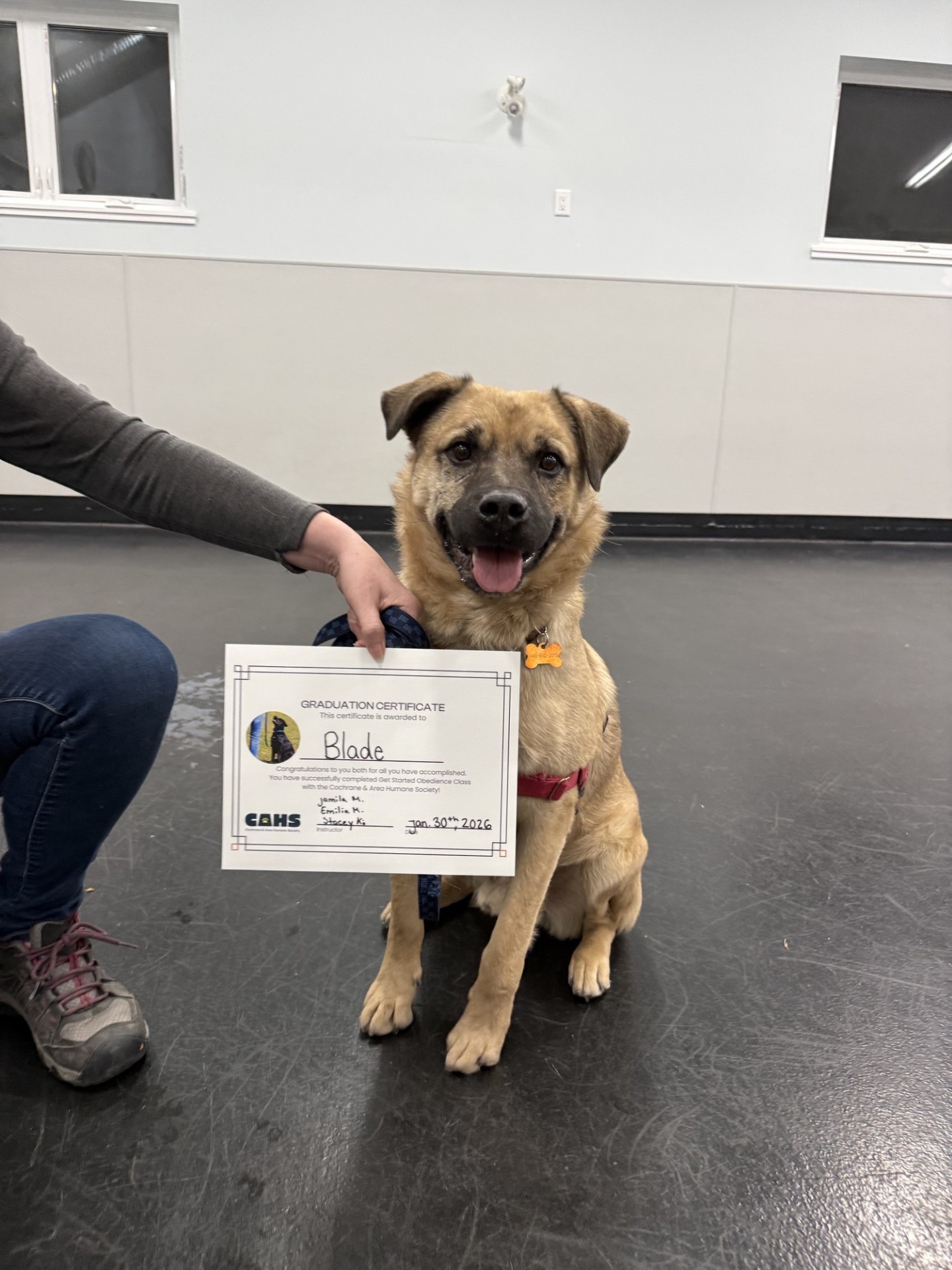 Blade graduated our Shelter Dog Obedience Program with a Volunteer! Ask our staff what he learned!