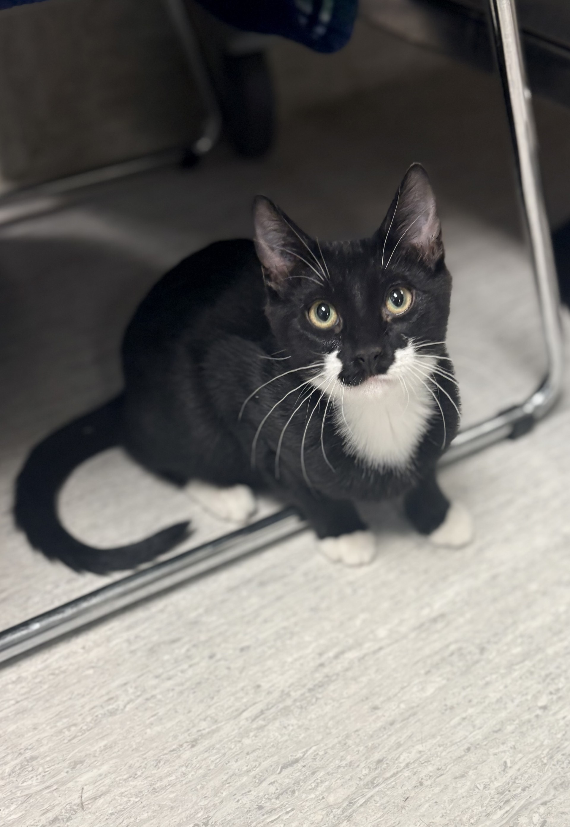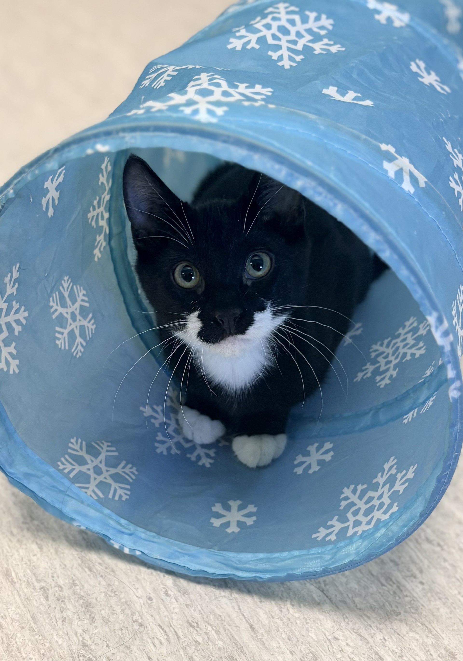 Cosmo is a tiny ball of energy with a superhero alter ego — around here, we call him “Spiderman.” Whether he’s sprinting across the room, bouncing off walls, or bravely defeating the evil toy army, Cosmo turns every day into an action-packed adventure. He can be a little skittish at first, but give him a confident feline friend and you’ll see him blossom. Cosmo looks to other cats for guidance and would thrive with a playful buddy to teach him the ropes and show him the world isn’t so scary. A full-time player with endless zoomies, Cosmo gives 110% to fun — until he’s all tuckered out. Then this little superhero trades in his cape for cuddle time, happily snuggling up with his cat companions for a well-earned nap.