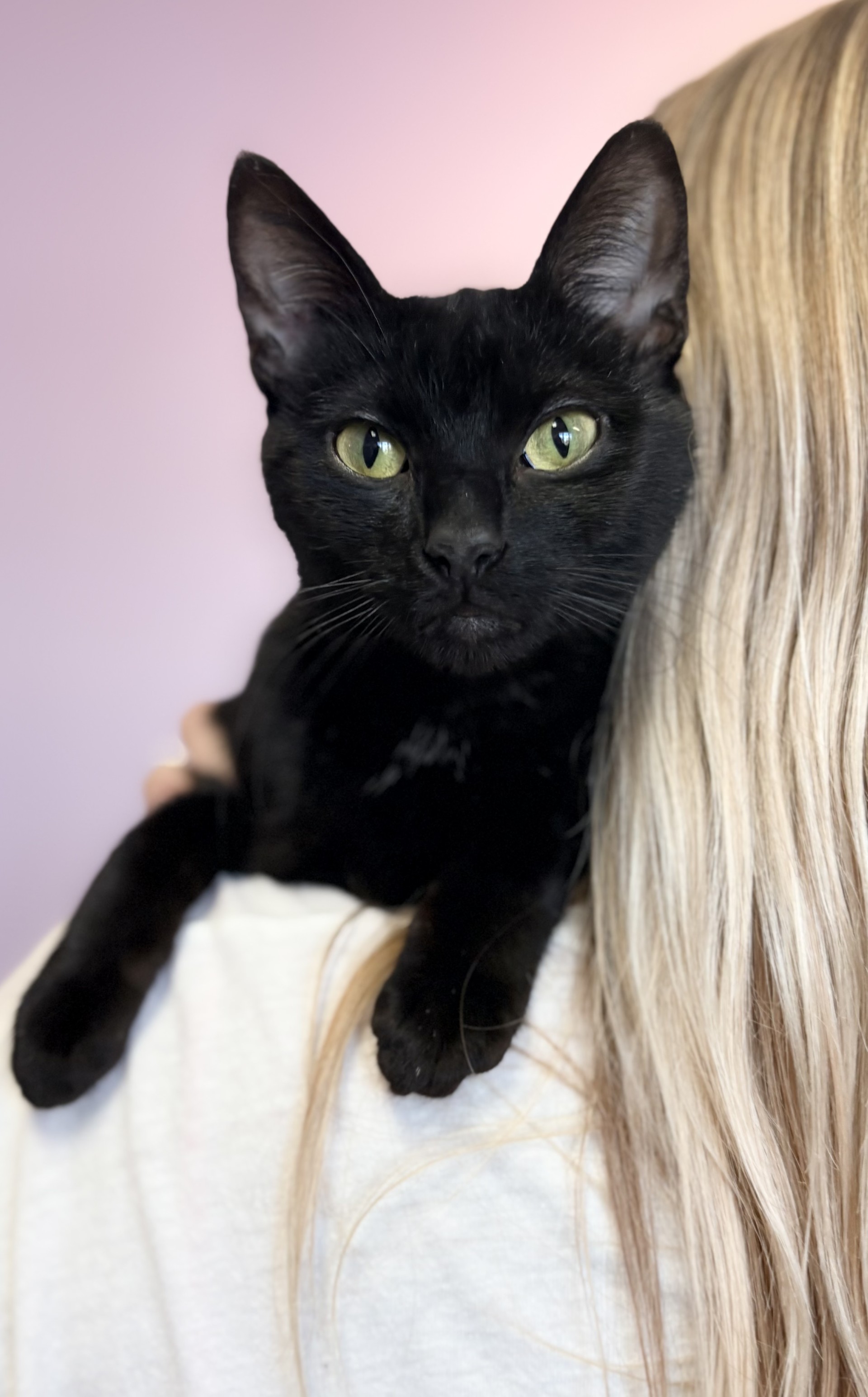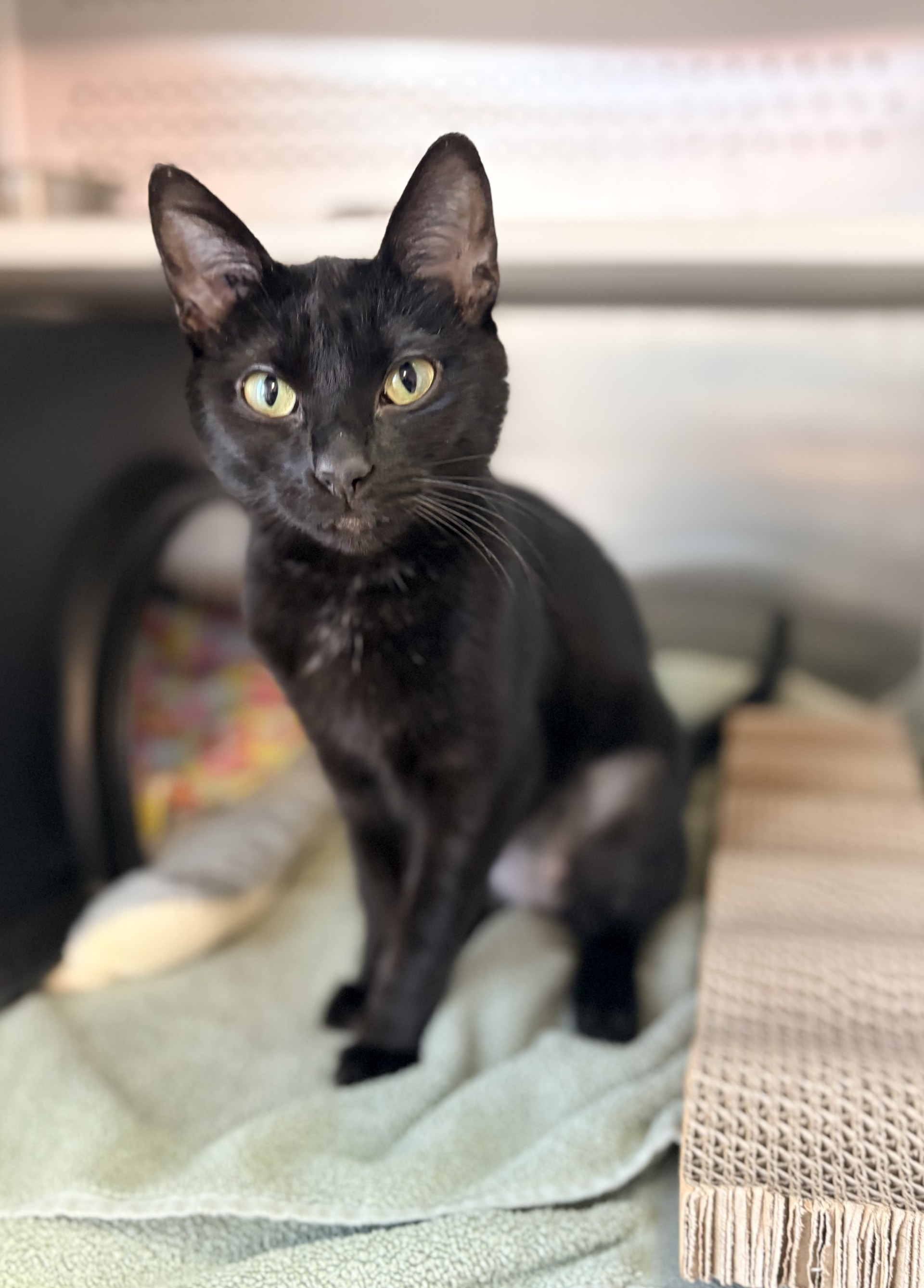 Dana may not always show it in photos, but she is truly a stunning girl with that classic, magical black cat energy. She’s incredibly loving and will happily rub around your legs while chirping for attention and affection. Dana would thrive in a home with plenty of high places to explore and cozy windows to watch the world go by.