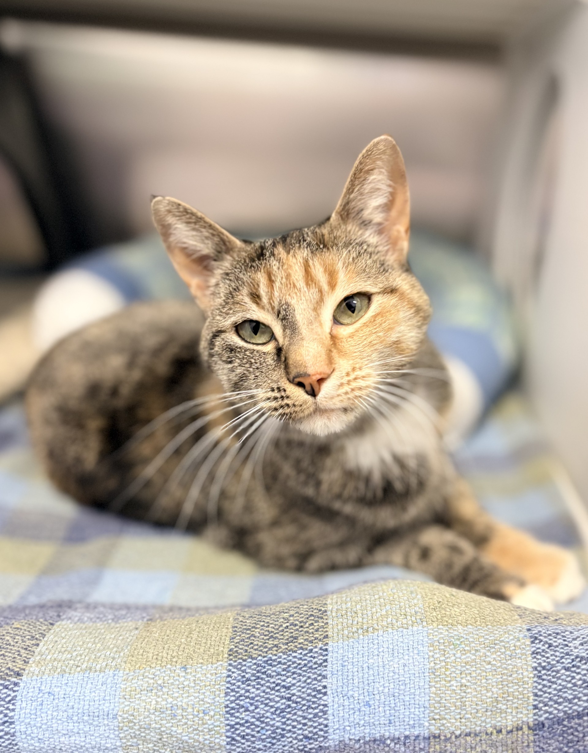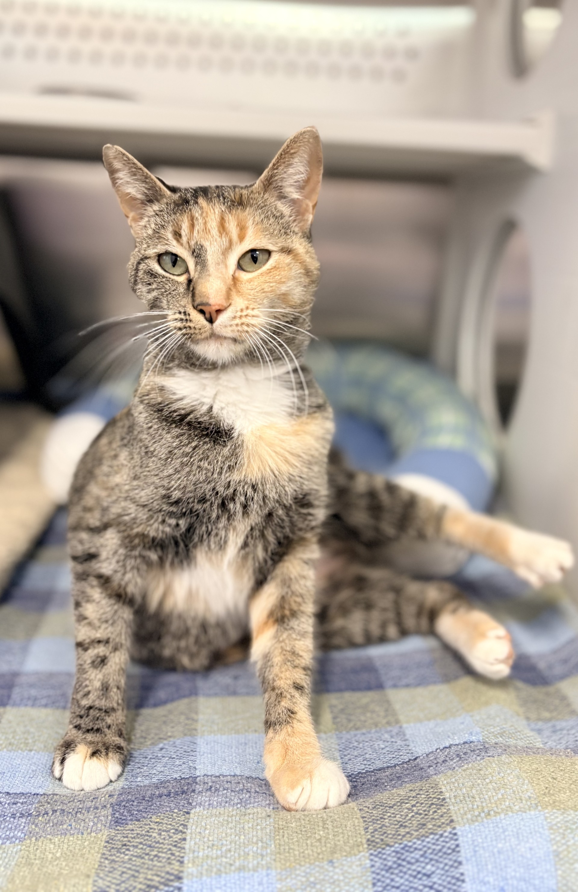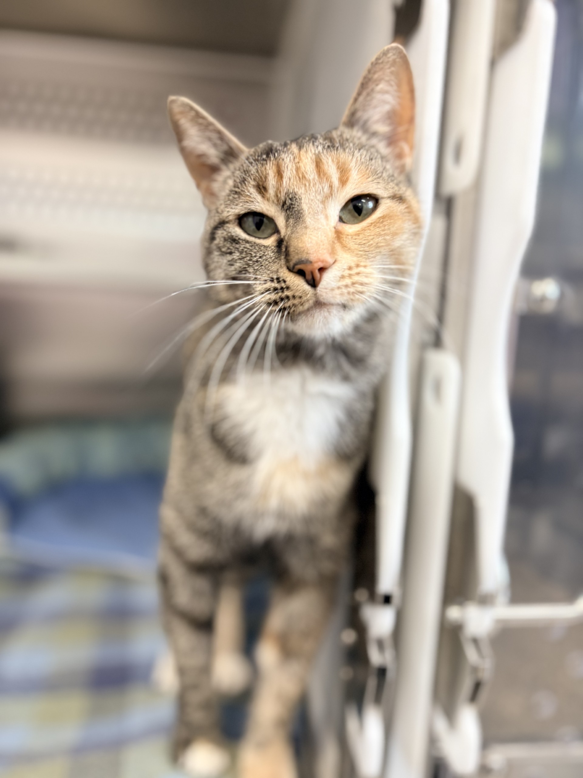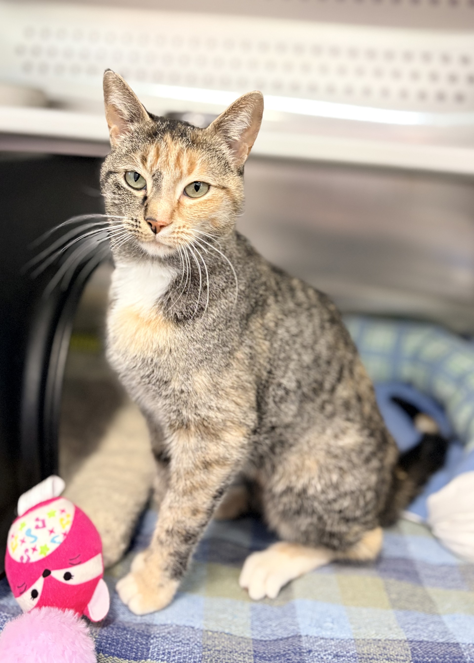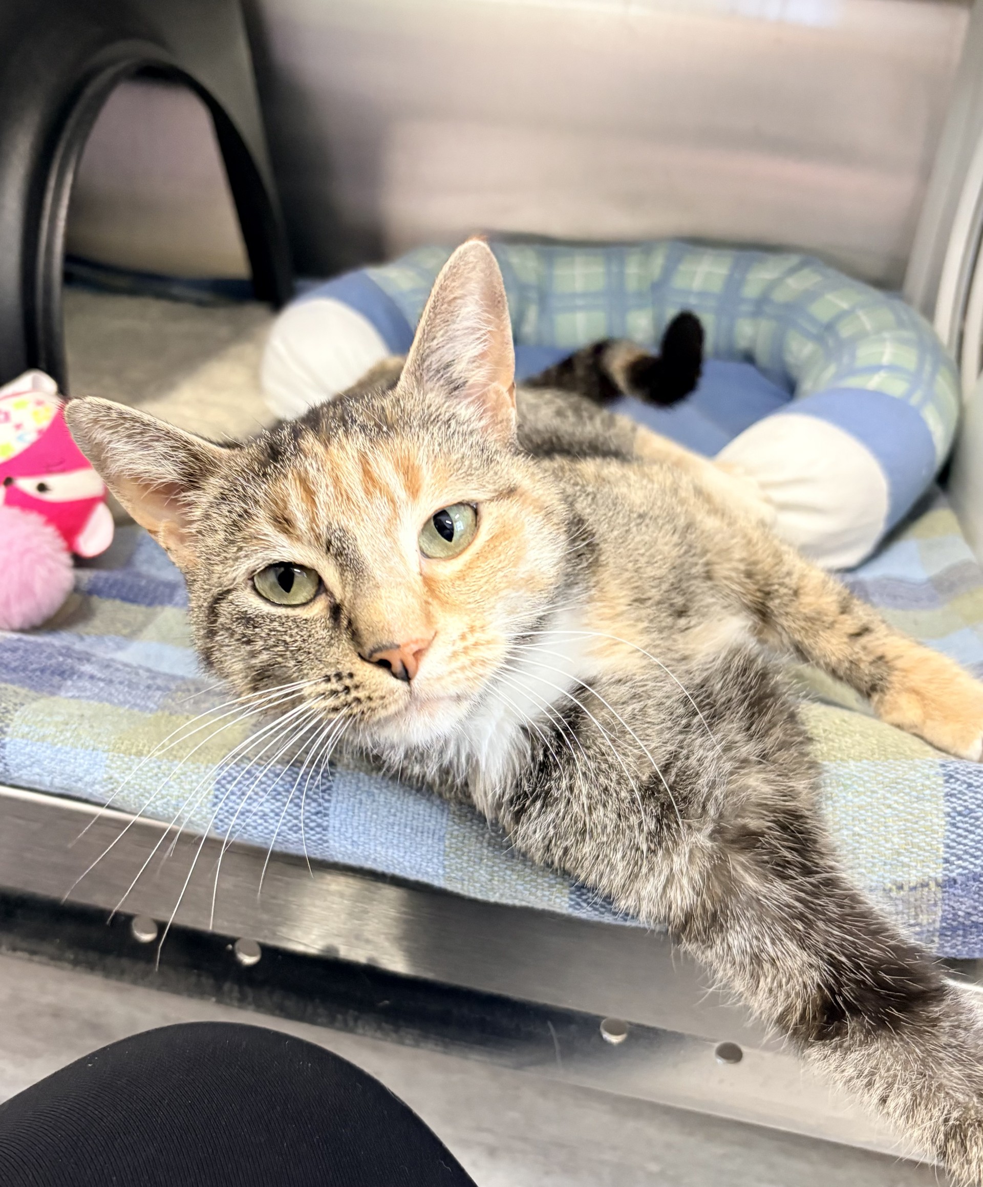 Don’t let her mildly grumpy expression fool you — Santos is truly a sweet little lady with so much love to give. She may not be the most photogenic gal (her serious face is just part of her charm!), but the moment you start giving her chin scratches, she’ll dramatically flop over to soak up every bit of affection. That’s her special way of saying, “I love you.” Santos would thrive in a home filled with fun toys to chase and bat around. She may even enjoy having a furry friend to keep her company and share in her daily adventures. If you’re looking for a loving, quirky companion with a whole lot of personality, Santos is ready to steal your heart — grumpy face and all!