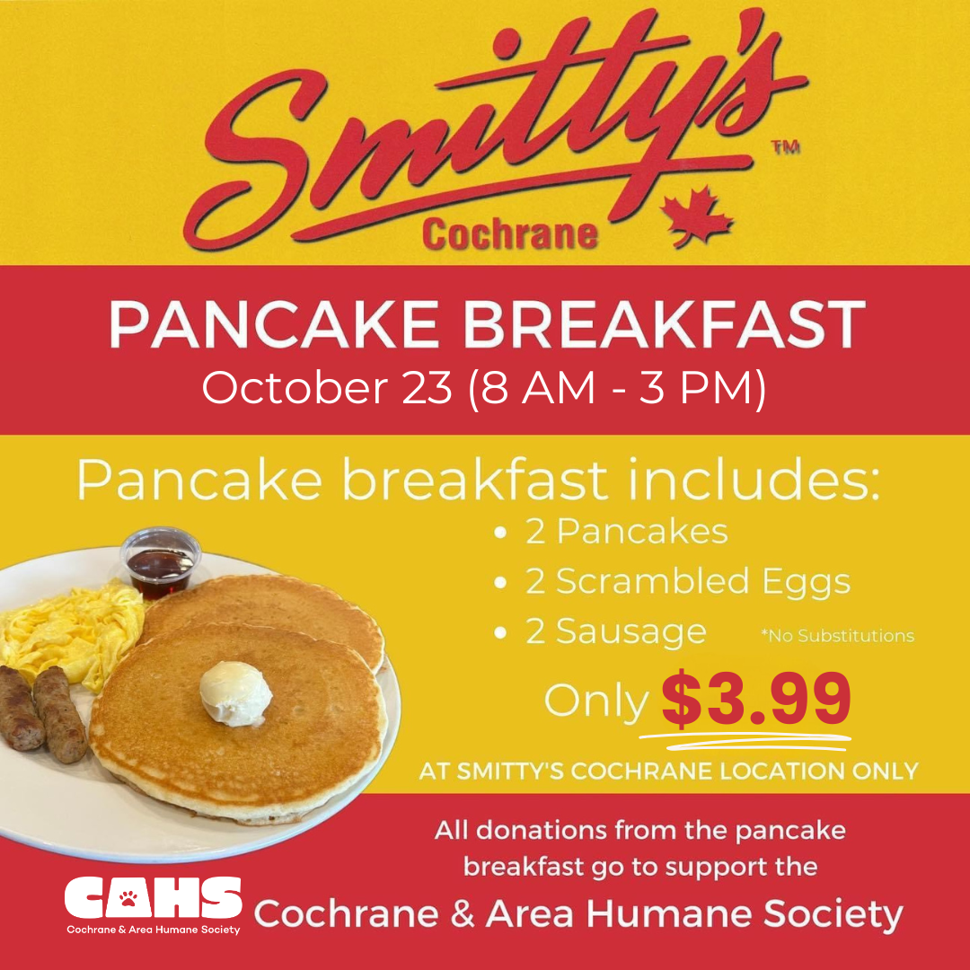Join us at Smitty’s Cochrane on October 23, 2025, from 8 AM–3 PM for a delicious breakfast featuring 2 pancakes, 2 scrambled eggs, and 2 sausages!